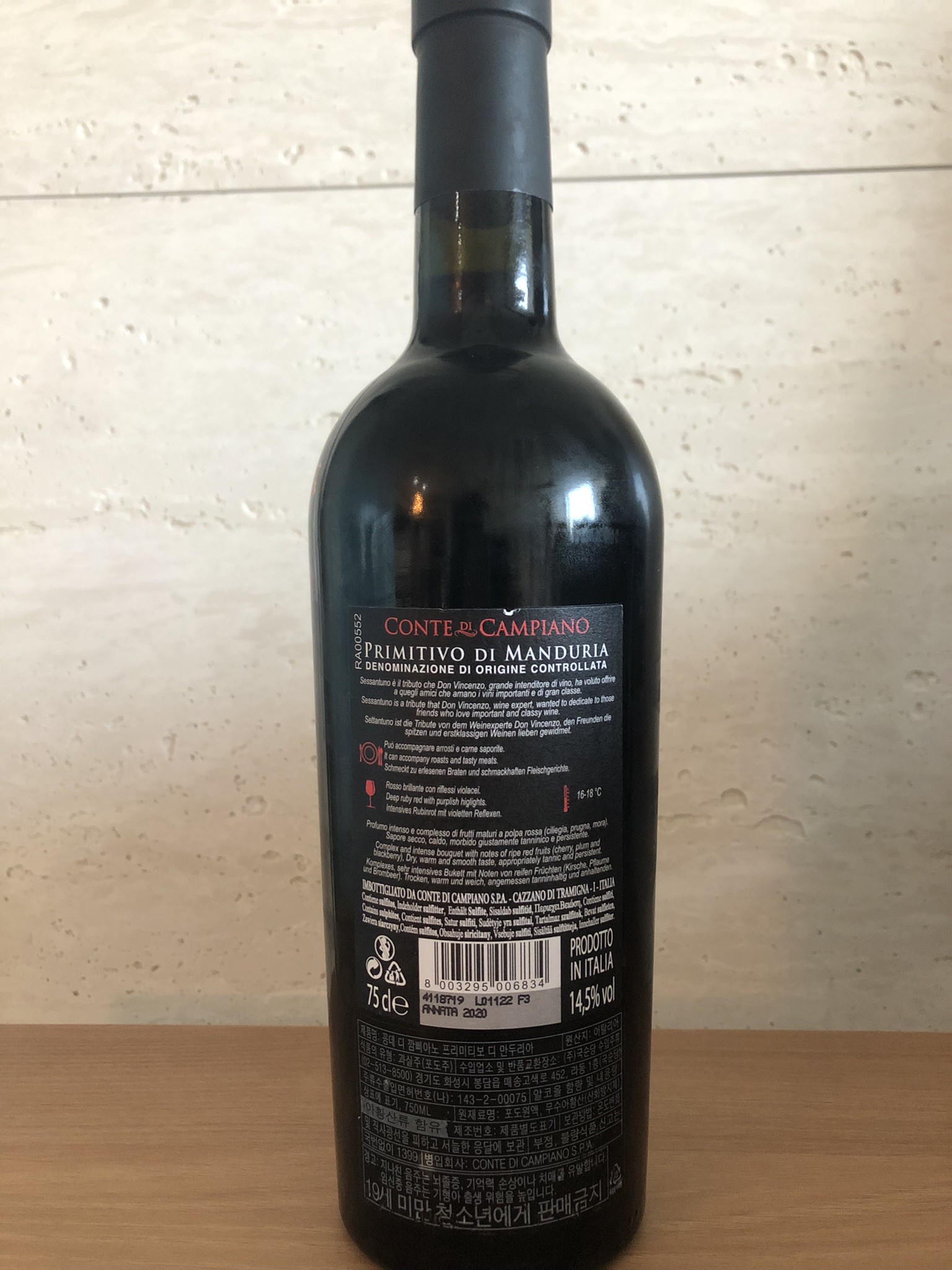 후면 라벨은 전부 다 모르는 이태리어 투성이다. 그나마 알아볼 수 있는 건 이 와인이 D.O.C. 등급의 와인이라는 것. 이탈리와 와인 등급은 D.O.C.G > D.O.C. > I.G.T > V.D.T (테이블 와인) 로 나뉘는데, D.O.C. 등급 정도의 와인만 골라도, 비싸지 않은 가격에 맛있는 와인을 마실 수 있다.